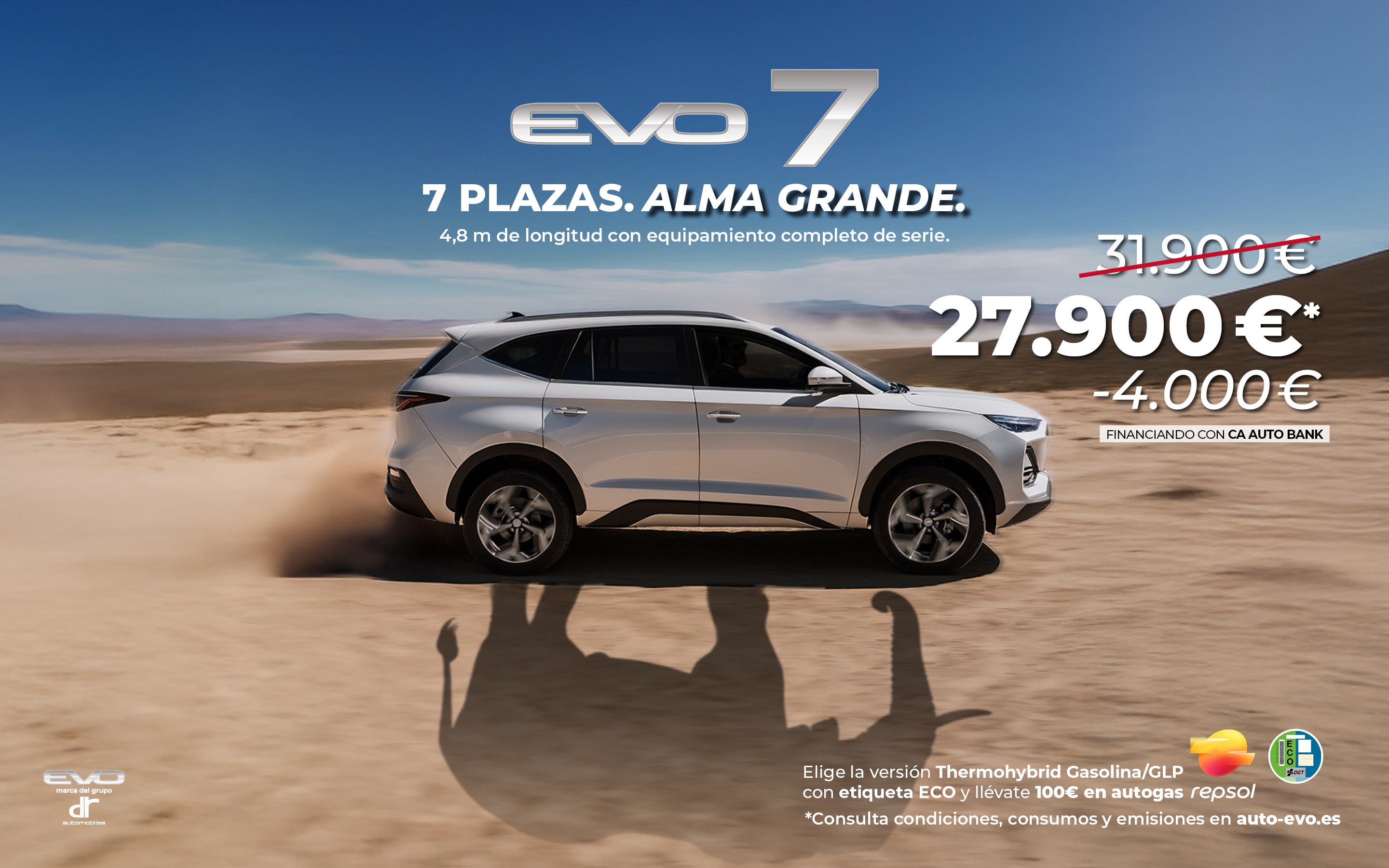 EVO 7 Gasolina/GLP. PVP Recomendado Financiando 28.900€. Incluye IVA, transporte, Impuesto de Matriculación (IEMT)